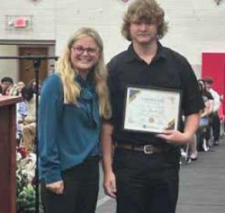 Ouachita Electric Marketing and Communications Specialist Sabrina Estridge presents Joe Alexander with the Lineman Scholarship. |